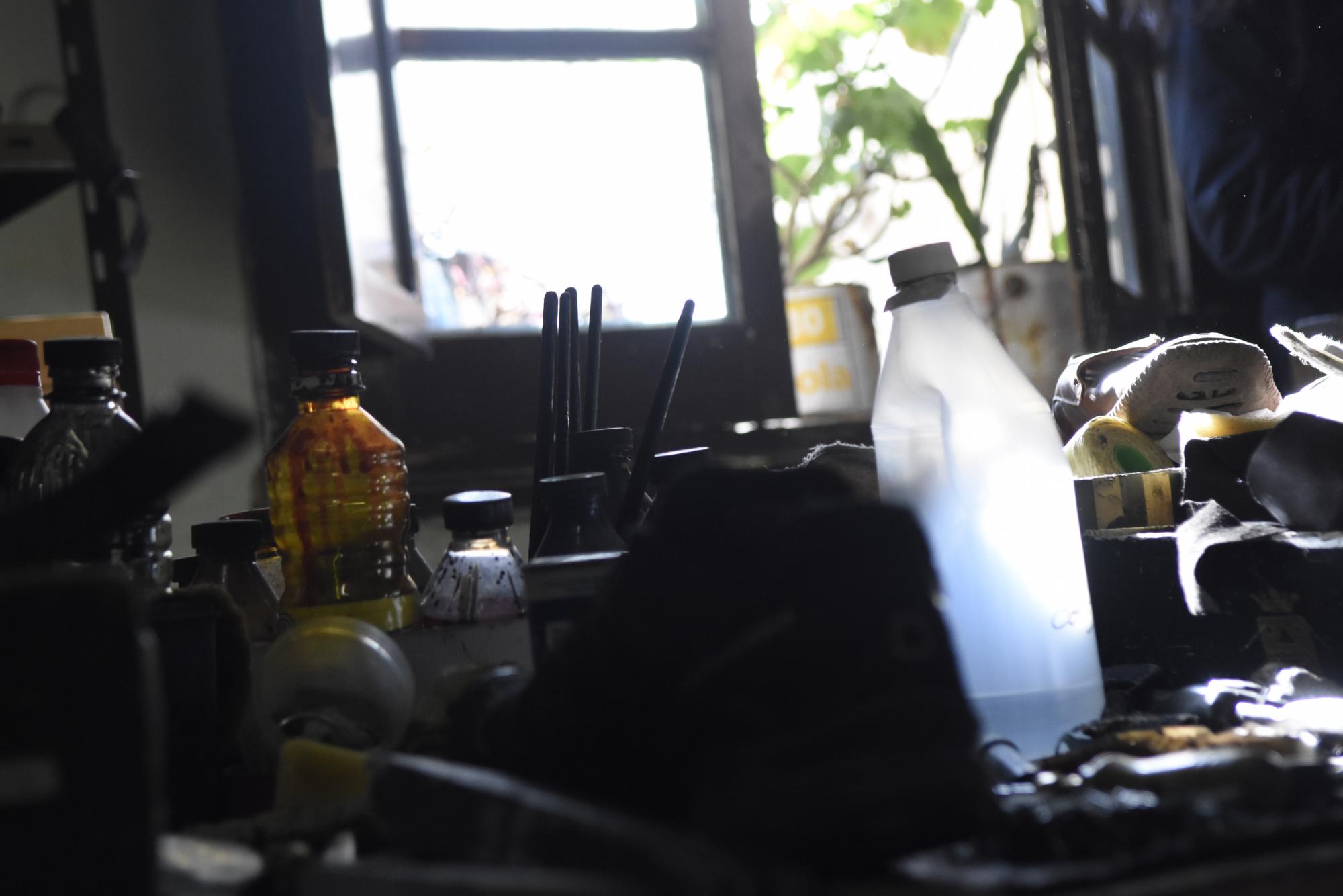 “Esta tinta la coloco a lo Picasso, con pincel”, enseñó el hombre, que arregla desde botines de fútbol despegados hasta los tacos de bailarines de malambo. Al lado hay otro par en terapia intensiva: tiene que cambiarle toda la suela, el trabajo incluye costuras internas y externas. “Un cambio así sale entre 700 y 800 pesos”, señaló.