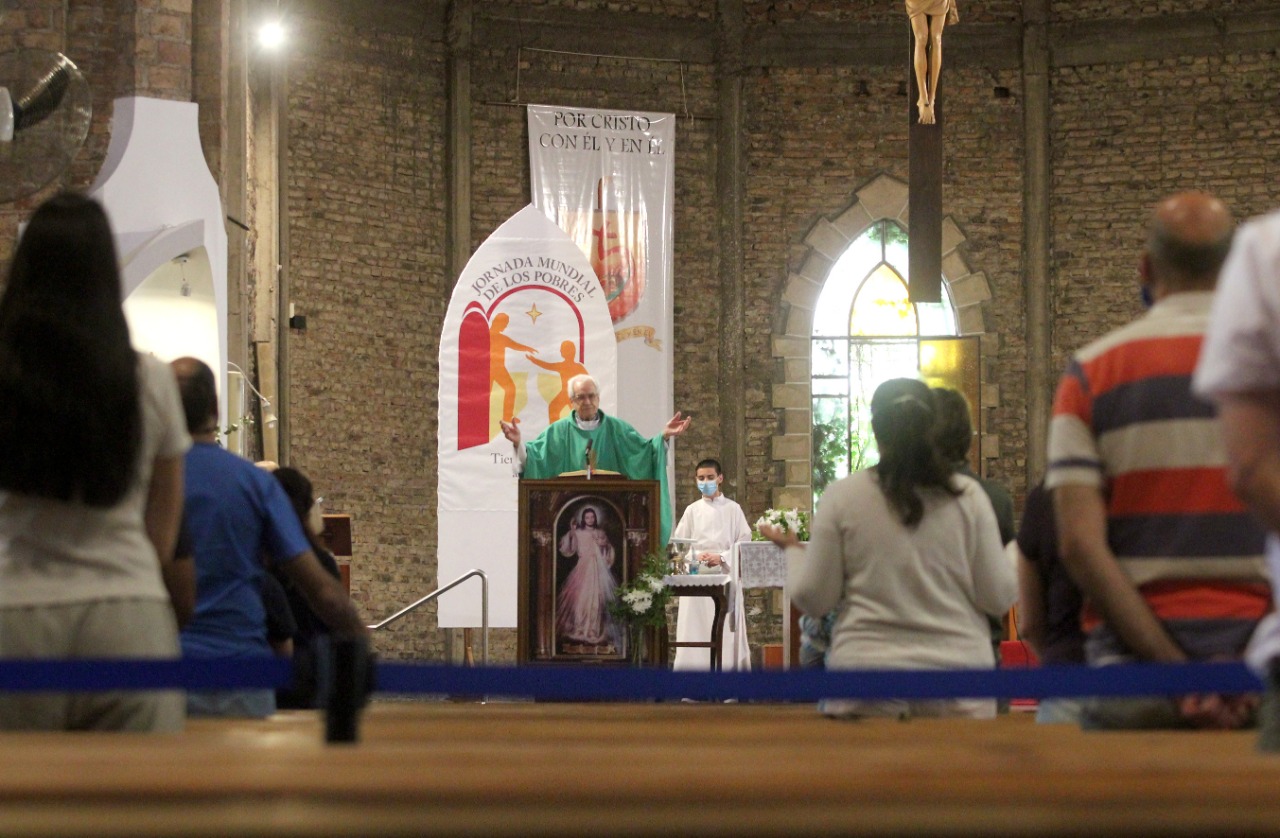 La Catedral María Auxiliadora abrió sus puertas esta mañana y recibió a los fieles con el protocolo de asistencia limitada y con alcohol para sanitizar a quienes ingresaban. La misa estuvo a cargo del sacerdote Carlos Duhourq.