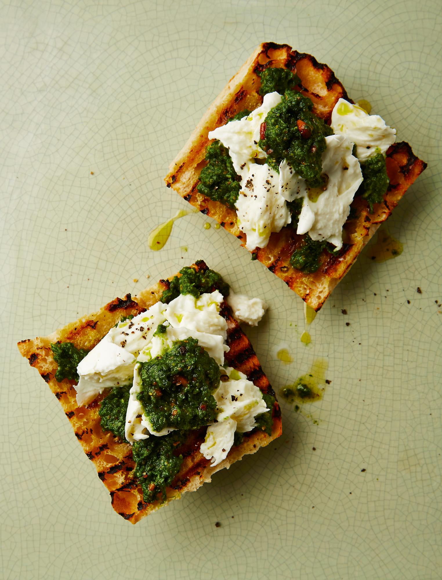 En el libro de cocina “Pimp your Toast”, por ejemplo, se encuentran pastas con porotos, limón y salvia o purés como uno de berenjena, menta y nuez. O bien garbarzos hechos puré. En 15 minutos se puede preparar una tostada con mozzarella y pesto verde. Para el pesto hay que blanquear hojas sin tallo de col verde y aplastarlas en un mortero con ajo, cáscara de limón, parmesano y piñones hasta formar una pasta. También se puede usar la procesadora eléctrica de mano. Luego sólo hay que servir esta pasta con mozzarella… y la tostada, por supuesto.