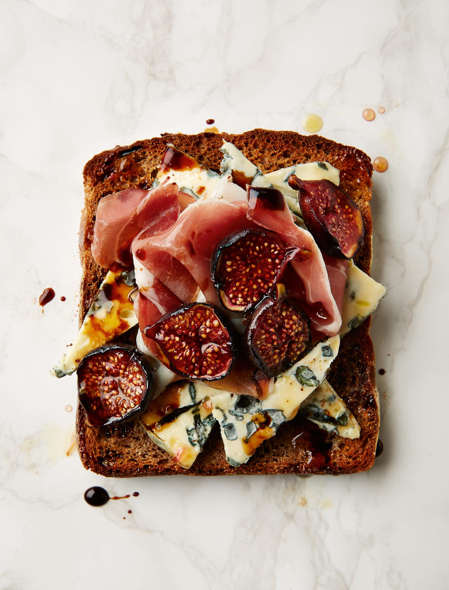 La tostada de higos y jamón crudo lleva un poquito más de tiempo. Primero, hay que asar en el horno los higos rociados con miel y aceite de oliva durante 20 minutos. Luego se corta queso azul en rodajas y se tuesta el pan. Primero se coloca un poco del líquido de la cocción al horno sobre el pan y luego se colocan el jamón y el queso. Finalmente se distribuyen sobre la tostada los higos y se rocía todo con el jugo restante y algo de aceto balsámico.