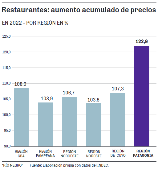 – Desde el año pasado, la Patagonia es la región argentina donde salir a comer más se está encareciendo en términos relativos. Por cada $100 de incremento de los demás precios de la economía, los de los restaurantes aumentaron en promedio $131. En este ránking, nuestra región está nuevamente escoltada por Cuyo y el Noroeste.