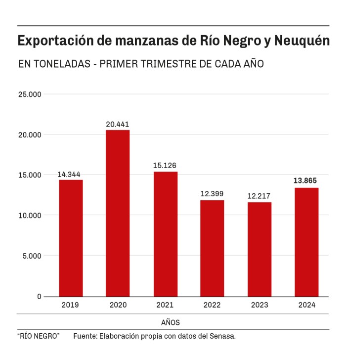 Las exportaciones de manzanas rionegrinas y neuquinas aumentaron un 13,5% interanual en el primer trimestre. Las mismas totalizaron 13.865 toneladas y constituyen el nivel más alto para el período desde 2021.
