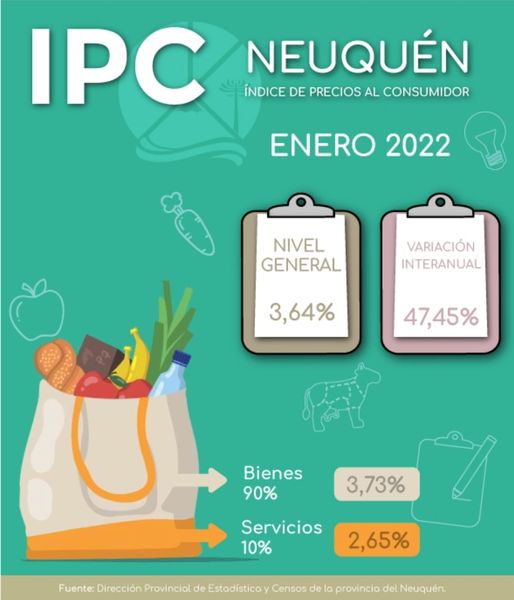 La Dirección Provincial de Estadísticas y Censos de Neuquén publicó los resultados del Índice de Precios de Consumidor del mes de enero de 2022. El relevamiento que mide una serie de comercios de la ciudad de Neuquén, que las principales subas mensuales se dieron en los grupos: Vivienda 8,03%, Equipamiento y Mantenimiento del Hogar 5,24% y Alimentos 4,36%.