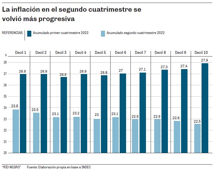 Por lo tanto, en el acumulado del año estas dos evoluciones se compensan hasta el momento. El decil 1 acumula una inflación de 55,6%, mientras que el decil 10 suma 55,1%.