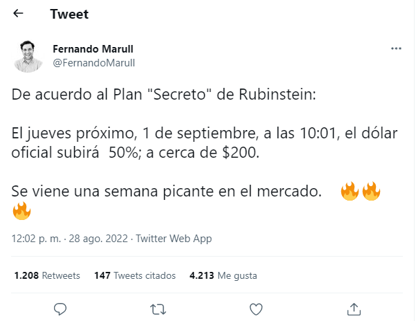 El economista Fernando Marull, ligado al macrismo, utilizó su cuenta de Twitter para vaticinar que «De acuerdo al Plan «Secreto» de Rubinstein: El jueves próximo, 1 de septiembre, a las 10:01, el dólar oficial subirá 50%; a cerca de $200. Se viene una semana picante en el mercado».