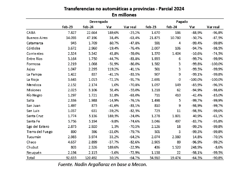 El punto es especialmente sensible en relación a las Transferencias No Automáticas (TNA), las cuales Nación envía a las provincias por fuera de los fondos coparticipables, y de las cuales suelen depender programas, asistencias, e incluso salarios en las provincias. La dinámica de recorte en el envío de fondos comenzó durante el primer mes del año, en el cuál muchas provincias directamente no recibieron fondos en concepto de TNA.
