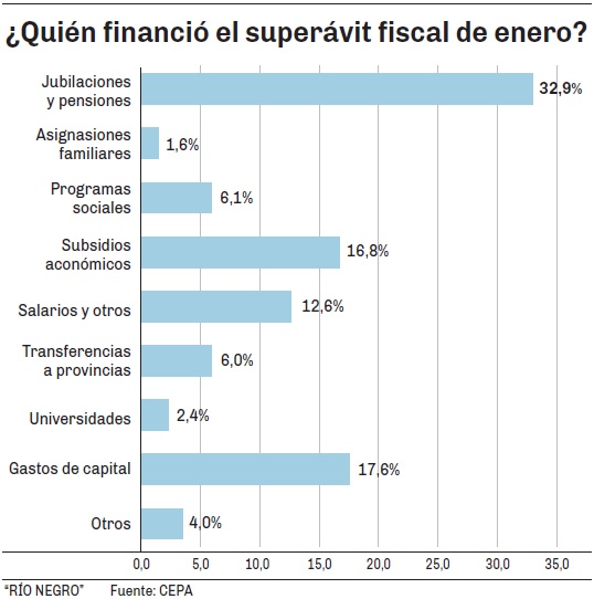 El aumento de los ingresos públicos en enero fue muy modesto. Así, el loable superávit fiscal financiero se consiguió a fuerza de reducción de gasto público. El CEPA estima que casi un tercio de este se financió con la licuación de jubilaciones y pensiones, siendo la partida más relevante en el cumplimiento del objetivo. Subsidios económicos y gastos de capital explican, conjuntamente, otro tercio. Del ajuste a la casta hay poco y nada.