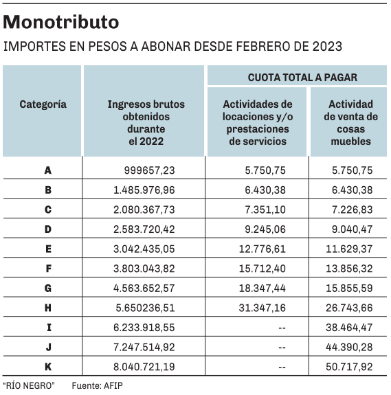 Según la tabla publicada por AFIP y que adjuntamos aquí, aquellos contribuyentes que abonen el monto integro de la cuota (considerando Jubilación y Obra social), deberán abonar a partir de febrero los importes detallados en función a la facturación que tuvieron durante el año 2022.