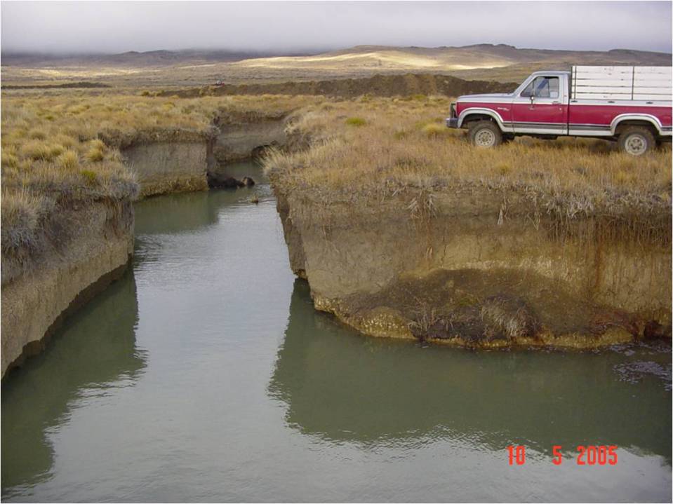 La conjunción de suelo desnudo, asociado a lluvias y escurrimiento, redunda en la profundización de las líneas de drenaje de estos ambientes. Se produce, entonces, un cambio de las condiciones del flujo del agua, con la profundización de la capa freática que nutre a las raíces de las plantas. Los humedales se han transformado de a poco, en estepas de muy baja producción.