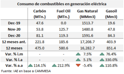 Durante el 2020 las centrales térmicas de generación eléctrica del país incrementaron notablemente el consumo de combustibles con una mayor huella de carbono como son el carbón, el gasoil y el fuel oil, en una tendencia que no fue adrede sino que respondió a la menor disponibilidad de gas natural para la generación.