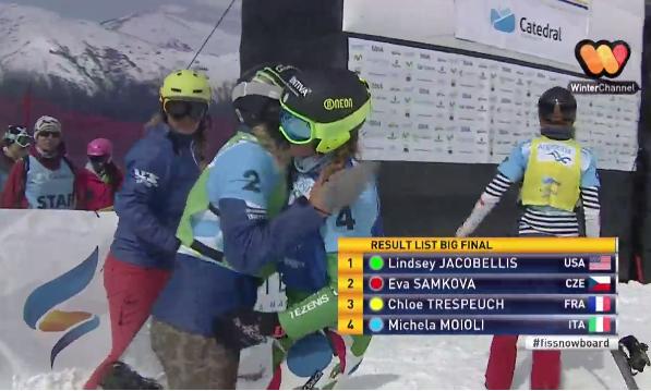 En mujeres la competencia quedó en manos de la estadounidense Lindsey Jacobellis, secundada or Eva Samkova de República Checa y en tercer lugar la francesa Chloe Trespeuch, quien ayer había logrado el primer lugar.