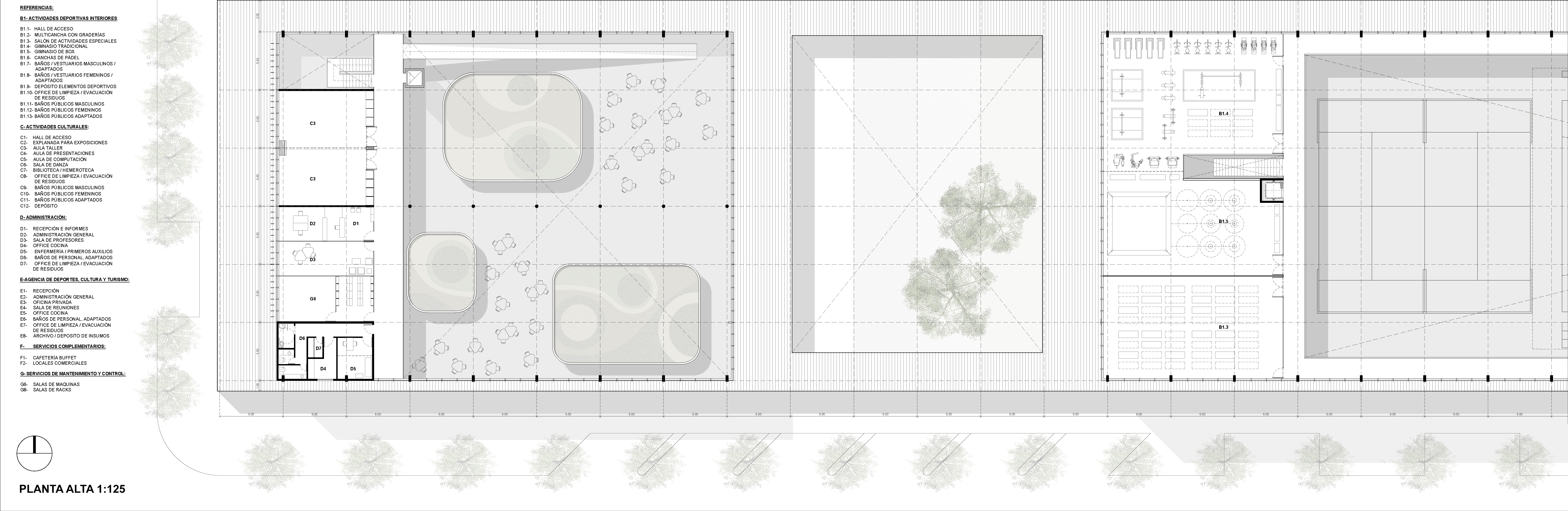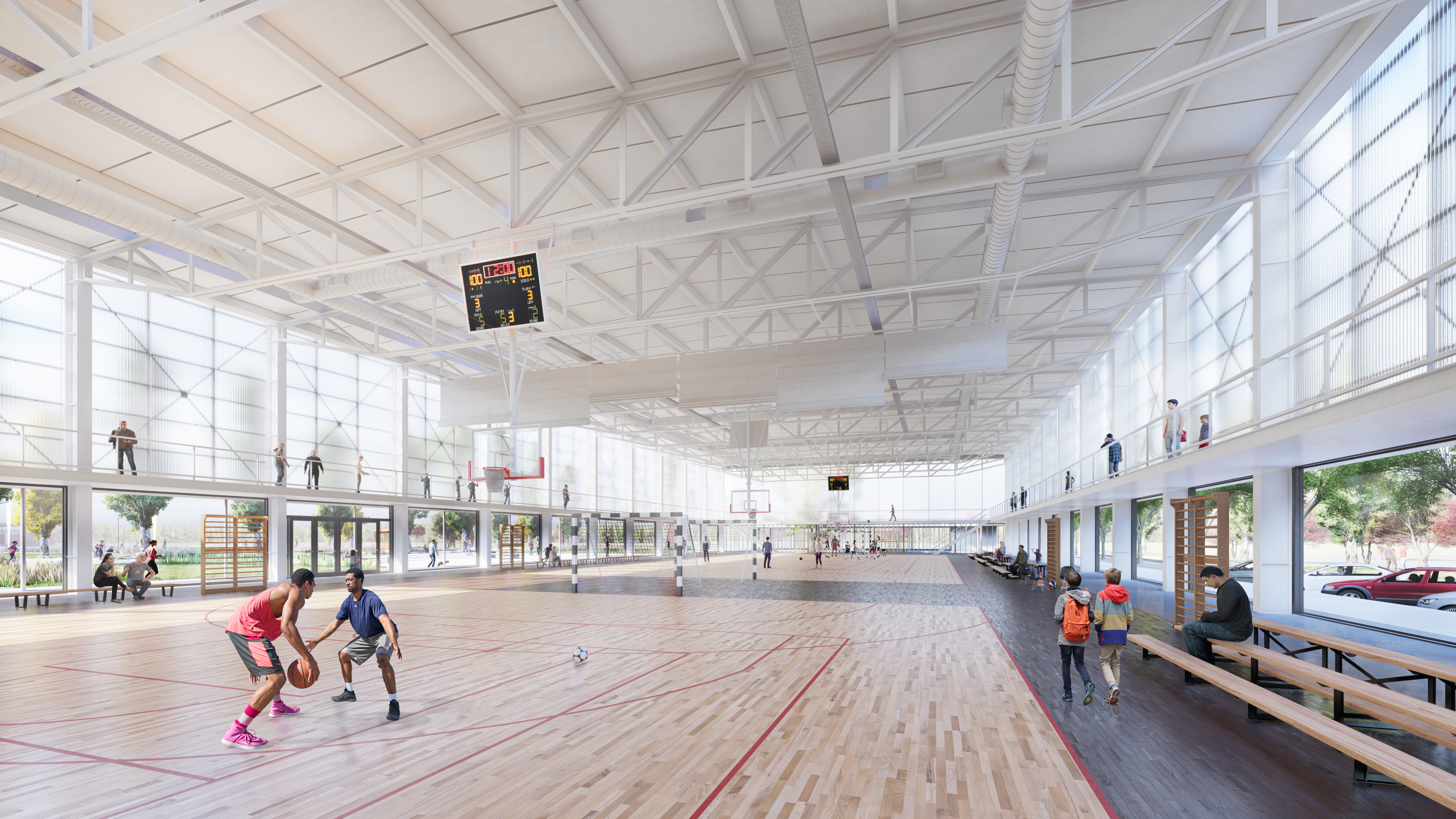 Un segundo volumen edificado de altura menor, contiene la mayoría de los servicios del parque y enmarca el acceso a las actividades deportivas descubiertas ayudando a su administración y control.