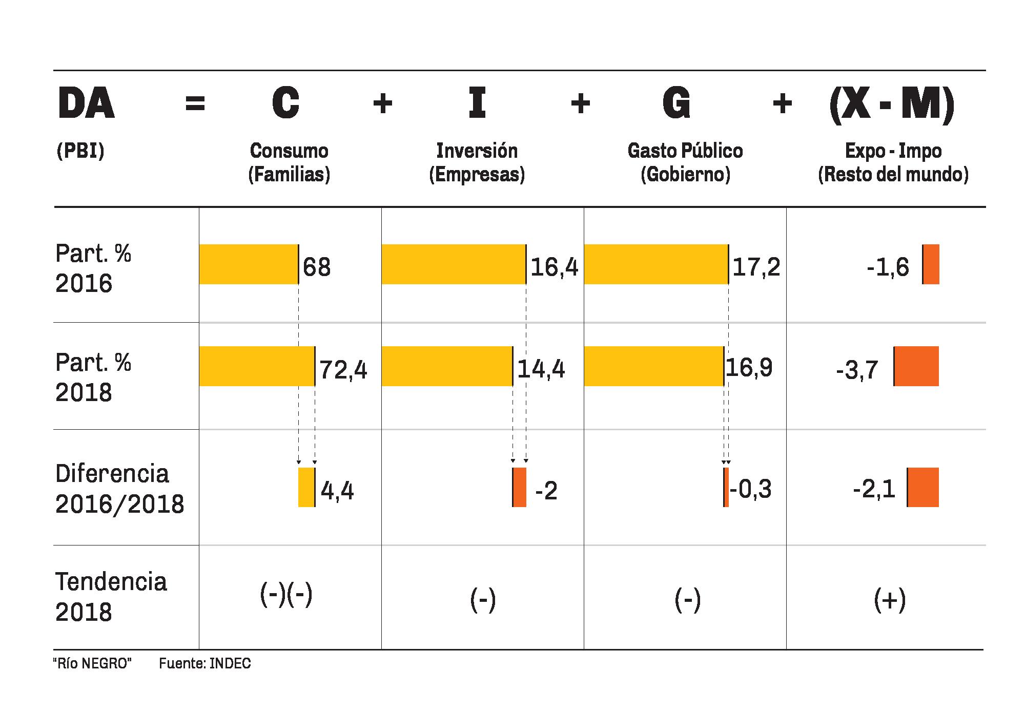 Desde principios del Siglo XX, cuando hiciera su aparición el análisis macroeconómico y las teorías keynesianas lograran un lugar protagónico en la escena mundial, una de las formas de cuantificar el Producto Bruto Interno (PBI) es mediante los componentes de la Demanda Agregada. Es la forma que utiliza actualmente el Instituto Nacional de Estadística y Censos (Indec). El método mide la dinámica de la producción de bienes y servicios en el país a lo largo del año, mediante la evolución de cuatro componentes. El consumo privado, que hace referencia a los bienes y servicios adquiridos por las familias y los particulares. La inversión, que refiere al gasto de las empresas privadas. El gasto público, que refleja la incidencia del Estado en su conjunto. Y por último la diferencia entre exportaciones e importaciones, que muestra la incidencia (positiva o negativa) del resto del mundo en la demanda doméstica.