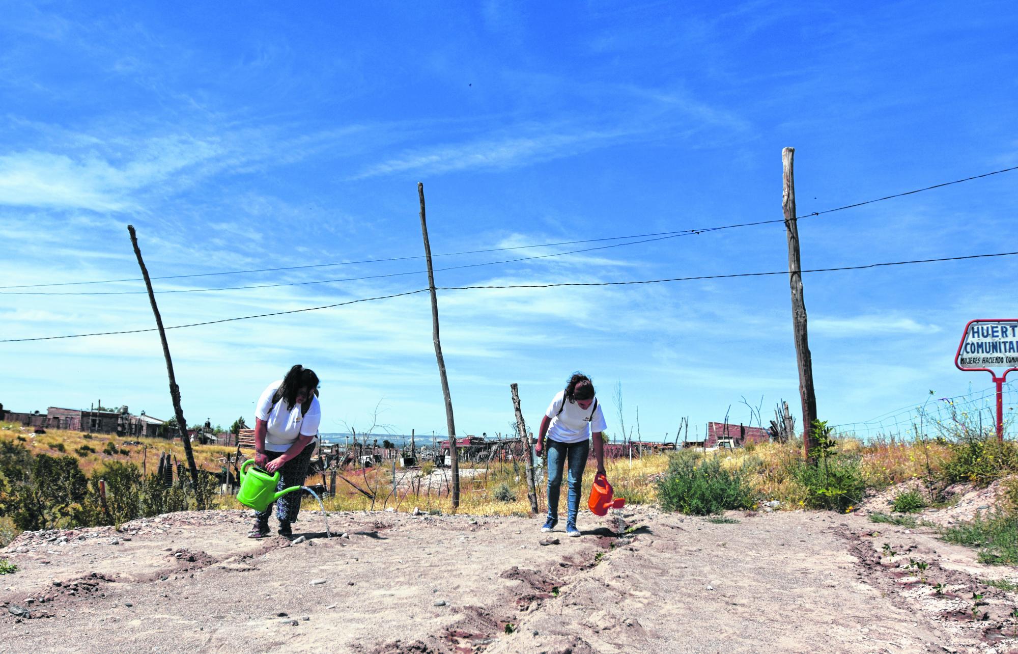 La mujer es vecina de l pedazo de tierra en que el grupo “Mujeres haciendo comunidad” lleva adelante su proyecto de una huerta comunitaria. Por estos días sólo humedecen las plantas de zapallo, morrón, tomate, choclo, sandía y uva, que son las que lograron sobrevivir a la escasa agua que reciben. Lo mismo los arboles que plantaron para tener sombra en algún futuro que esperan cercano.