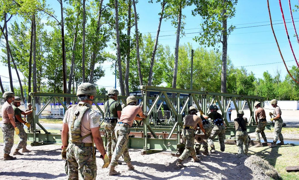 La instalación del puente, que estará ubicado a un lado de unos de los ingresos principales al predio sobre Ruta Nacional 22, está a cargo del personal del Ejército Argentino.