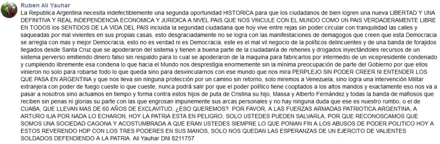 «Yahuar, quien fue intendente de Los Menucos y precandidato a gobernador alienta un nuevo golpe de estado. Siendo el mismo afiliado al PJ rionegrino solicito su inmediata expulsión del partido como así también la actuación de oficio de la justicia penal federal y/o provincial ya que estamos en presencia de un flagrante delito».