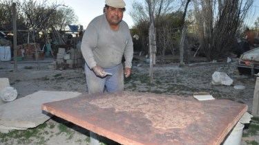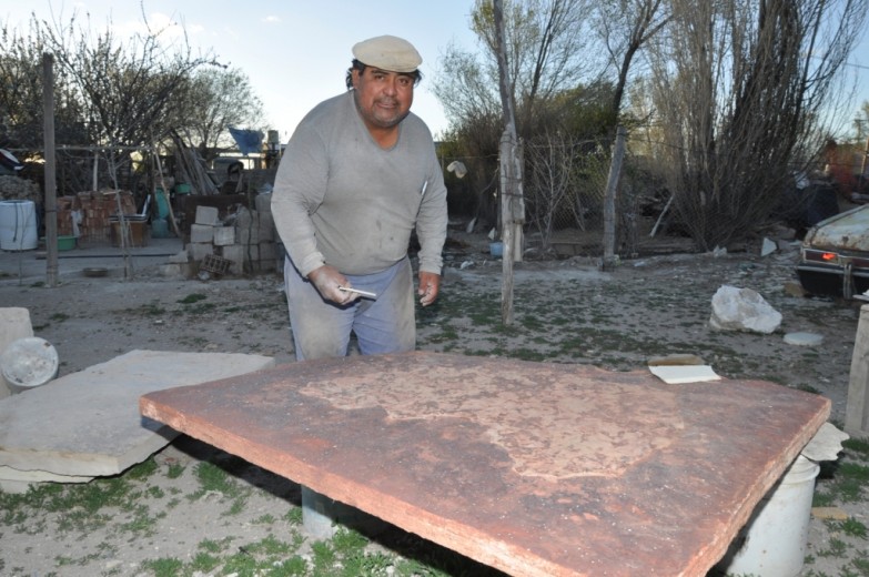 Sebastián Llanquitrú, o “Fillol” como lo llaman por su pasión futbolera, trabaja la piedra laja hasta transformarla en una obra de arte. Con paciencia y dedicación, ha hecho pisos, el escudo provincial que se ve en la Legislatura y hasta una vereda de Bariloche.