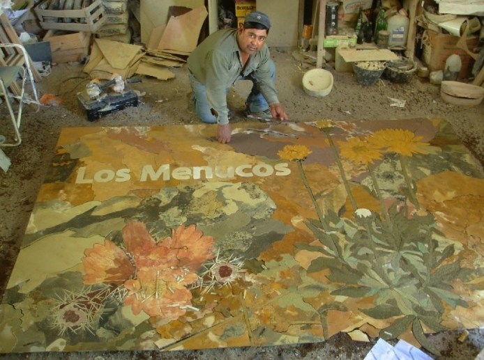 “No es un trabajo pesado, pero sí tenes que estar muy concentrado. Cuando hay que hacer algún mural o una vereda, primero haces una plantilla con plástico o cartón con el dibujo. Luego elegís la piedra de acuerdo al espesor, el color y la textura antes de empezar a construir las distintas piezas”, agrega.