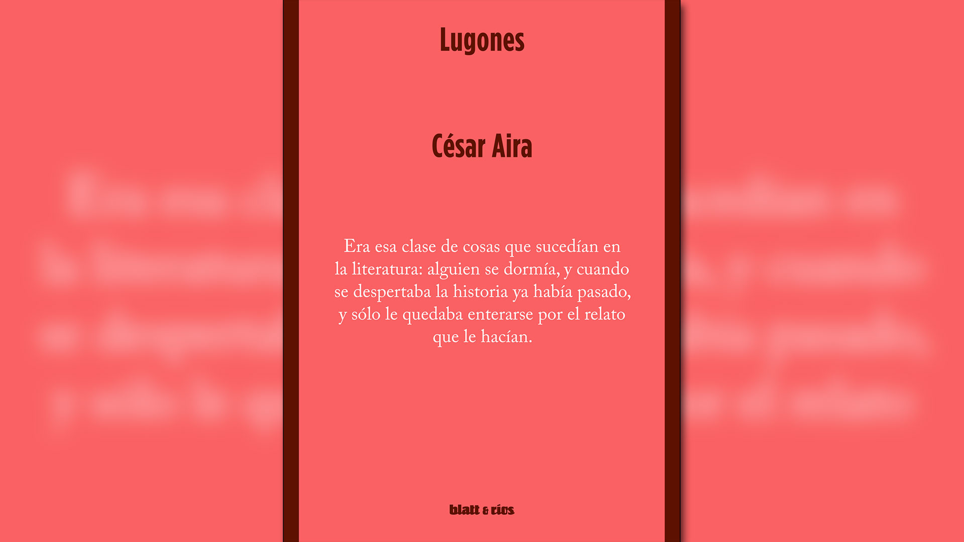 En la novela «Lugones», la número ciento seis del escritor César Aira, el misterioso narrador traslada al lector desde una vigilia disparatada con la llegada del «más grande escritor argentino», Leopoldo Lugones, a la isla que elige para suicidarse hasta un mundo surrealista, sobre todo onírico, donde el absurdo lo provoca el verdadero goce del «disparo de la realidad: la ficción».