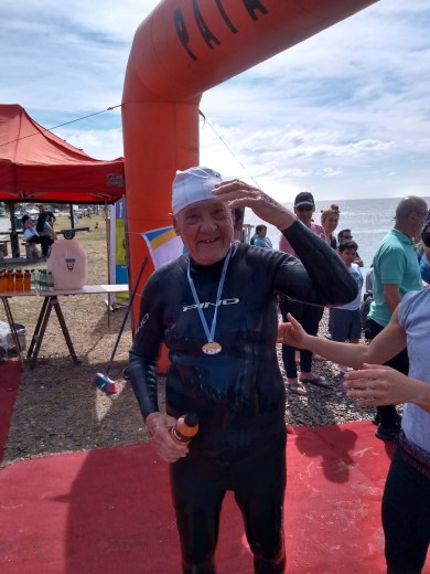 Juan comenzó la práctica de la natación competitiva hace apenas un par de años. Pero lo tomó como un nuevo desafío personal. “Hasta donde puedo dar”. Las primeras experiencias las realizó en la competencia de los 4 puentes, en la categoría mayores de 70 años, donde consiguió los primeros puestos en cada temporada que participó.