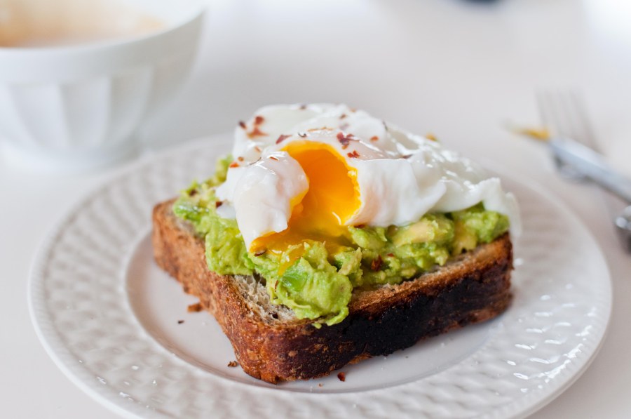 En un bol, colocar la palta pelada y cortada en rodajas con un poco de jugo de limón. Pisarla hasta obtener un guacamole, no 100% liso, pero sin grumos muy grandes. Dejar en la heladera. Para hacer el huevo poché: Llenar una olla grande con 3/4 de agua. Volcarle 100 ml de vinagre y dejar que el agua llegue a ebullición, luego bajar el fuego a mínimo para que no burbujee. Hacer un remolino grande con una cuchara de madera y, cuando desacelere un poco, romper un huevo en el centro despacio para no desarmar la yema. Cocinar 4-5 minutos hasta que la clara esté coagulada. Sacarlo con una espumadera, sacarle la clara que pueda estar suelta en los bordes Tostar los panes, esparcirles guacamole encima y terminar con el huevo poché. Condimentar con sal, pimienta y algún otra especie o hierba que se desee y disfrutar.