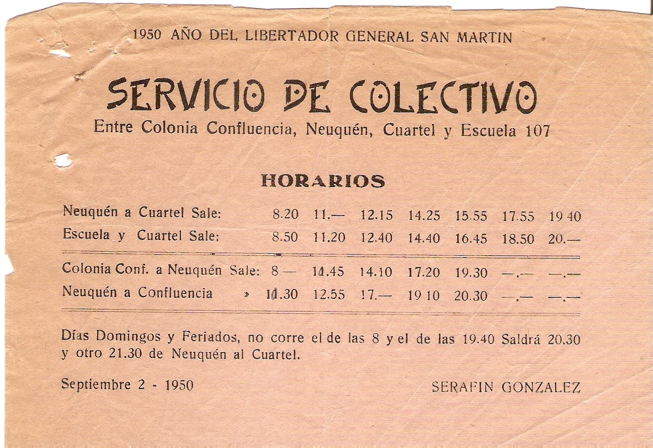 Desde la colonia hacia el centro, las salidas y llegadas eran solo cinco. “Días domingos y feriados, no corre el de las 8 y el de las 19.40 saldrá a las 20.30 y otro a las 21.30 de Neuquén al Cuartel”, decían los anuncios de la época.