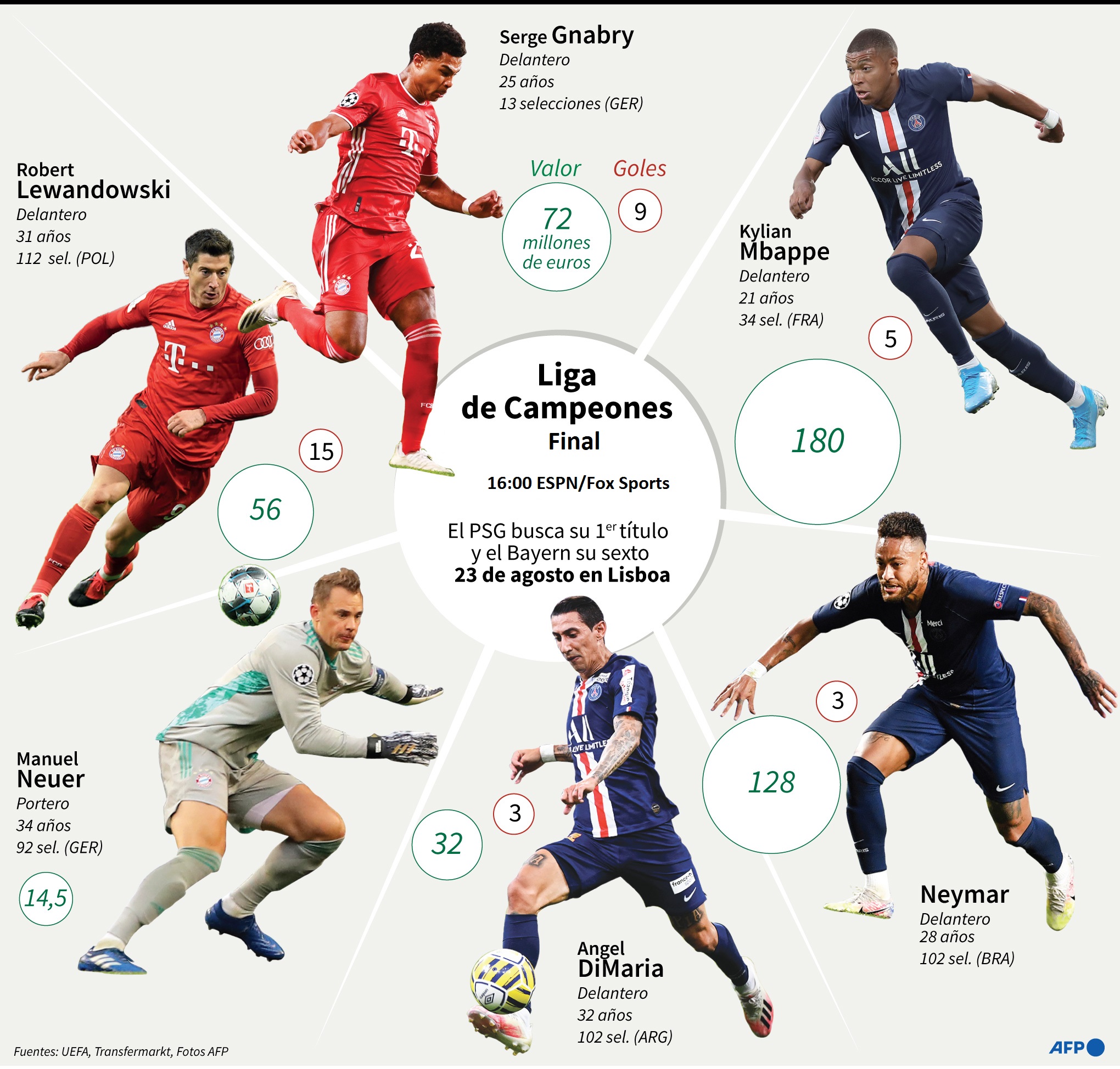 En el PSG, Neymar tendrá gran oportunidad para justificar los 222 millones de euros desembolsados por su fichaje al Barça en 2017. Para el equipo parisino será la primera final de su historia, alejando el fantasma de la maldición europea que temían sus hinchas.