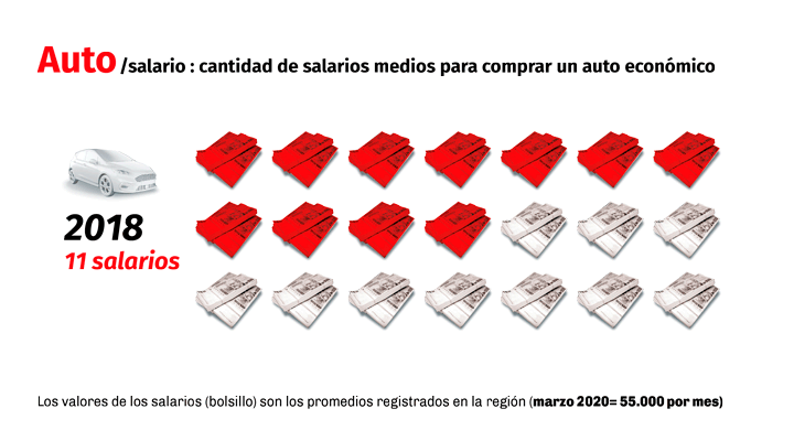 Computando la evolución económica de los últimos años, los números saltan a la vista. En solo 24 meses la pérdida de poder adquisitivo del salario fue enorme. Parte importante de la clase media está cada vez más lejos de acceder a su vivienda propia, auto 0 kilómetro o vacacionar unas pocas semanas al año (ver infograma adjunto). Con el salario medio hoy, por dar un ejemplo cualquiera, se puede comprar solo el 18% de un metro cuadrado de un departamento de dos ambientes en el centro de la ciudad de Neuquén. Algo que es irrisorio para cualquier sociedad que pretende lograr en el tiempo llegar al sueño, por ejemplo, de la casa propia. Casi dos décadas atrás, un empleado medio lograba bastante más de un metro cuadrado con su salario. La cuenta seguramente sería la misma para la adquisición de un auto o las salidas a vacacionar. Estos son solo algunos de los tantos índices que muestran el profundo retroceso que viene sufriendo nuestra sociedad en materia económica.