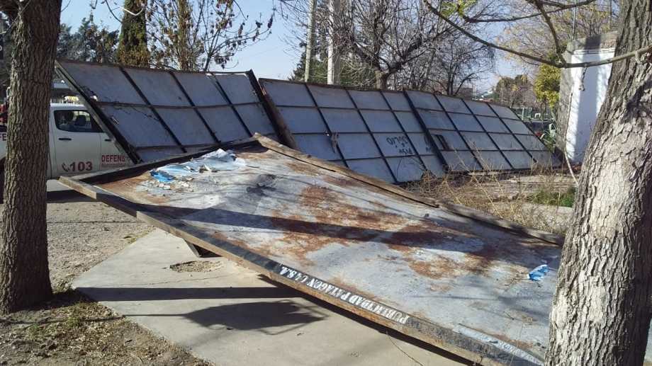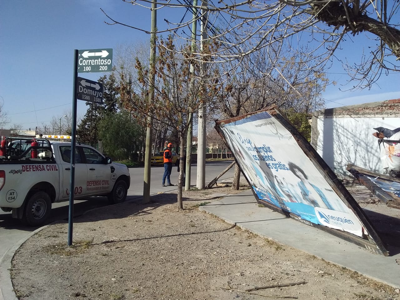 Baggio indicó que un cartel pequeño de la heladería del centro cayó sobre la calle Ministro González. El letrero indicador ya fue retirado del lugar sin ocasionar lesiones ni otros daños materiales.  Otros letreros callejeros cedieron ante la fuerza del viento sobre la esquina de calle Correntoso y Domuyo.