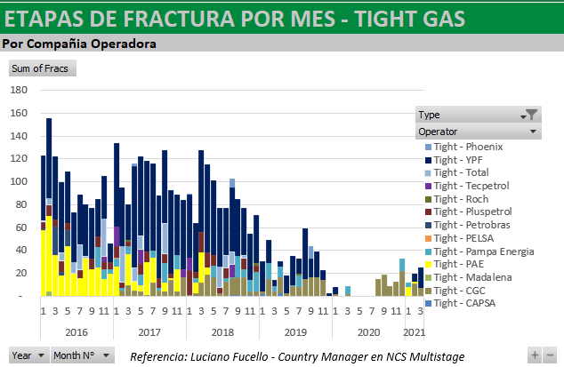 Si bien el nivel general de las etapas de fractura en el tight no es de lo más alto, ya que por ejemplo en diciembre se habían realizado 33 punciones, sí marca un ritmo sostenido en el segmento que atravesó largos meses sin sumar ni una sola fractura.