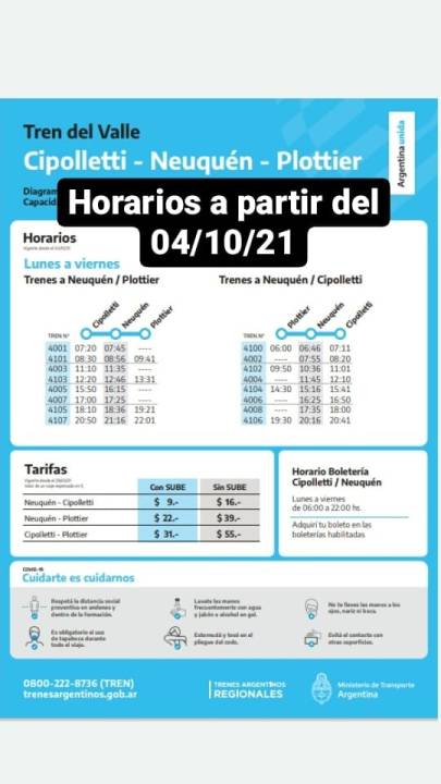 Trenes Argentinos difundió los nuevos horarios que regirán desde el próximo lunes en los servicios del Tren del Valle que se prestan en los recorridos a Cipolletti, Neuquén y Plottier durante los días se semana.