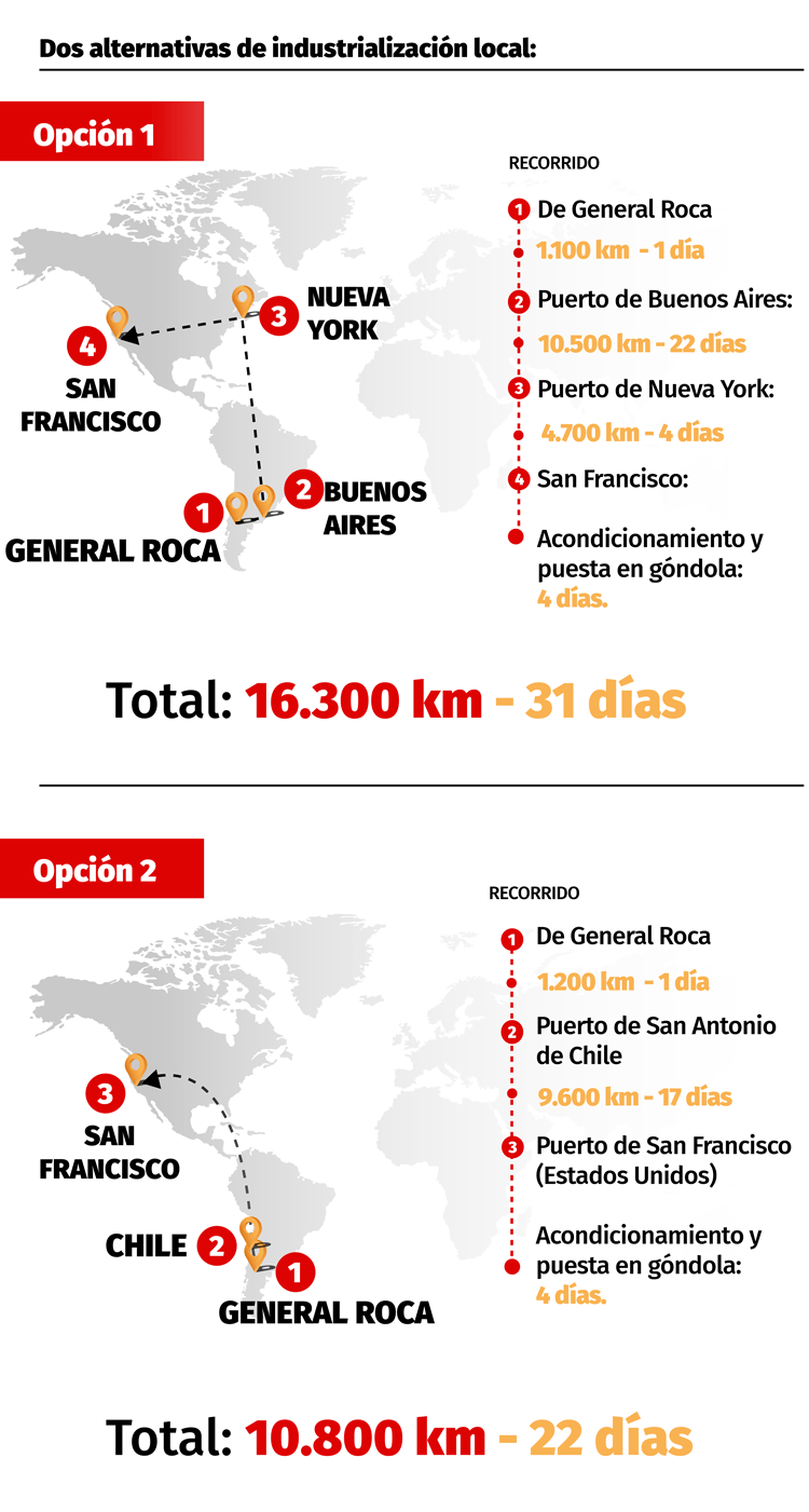 Esto suena algo totalmente irrisorio e irracional. Pero es lo que se hace. Si existiera este tipo de industria en nuestra región, los kilómetros -en el mejor de los casos- para llegar a este mismo destino serían poco más de 10.000 y en 21 días estaría el producto a disposición del consumidor norteamericano.