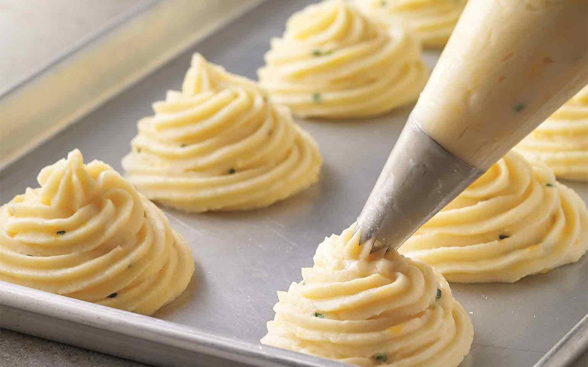 Enmantecar un molde o bandeja. Verter el puré dentro de una manga de repostería. Rellenarla unas 3/4 partes con la mezcla. Entonces armar las papas duquesas en forma de escarapela redonda o roseta.