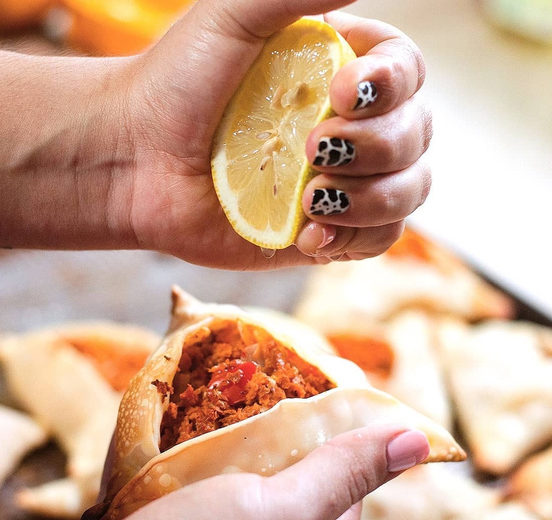 Armar las empanadas en forma triangular, que se vea un poco del relleno. Hornear en placa aceitada, fuego medio por unos 30 minutos o hasta que este tostada la base y la superficie. Acompañar con más limón