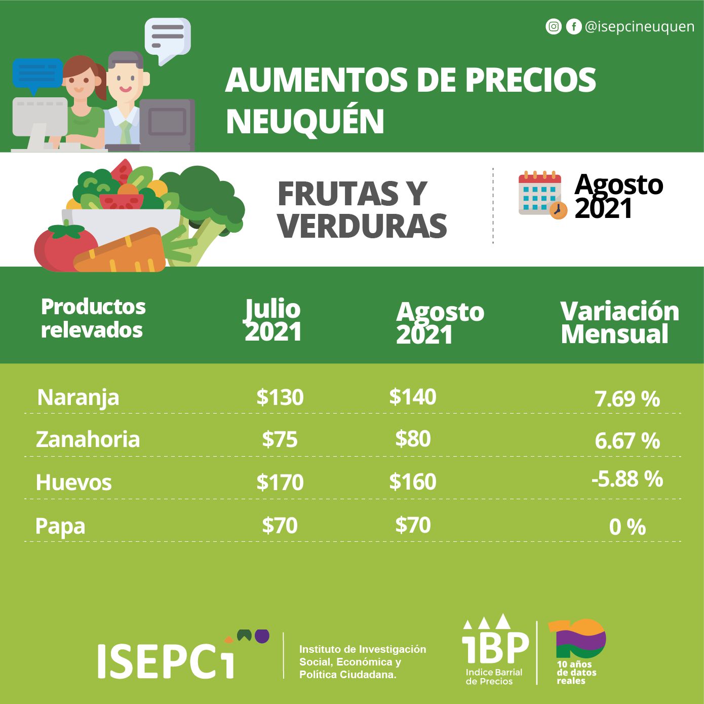 Las frutas y verduras aumentaron un 0.24%, las carnes sufrieron incrementos del 0.70% (en julio había aumentado un 4,21%)