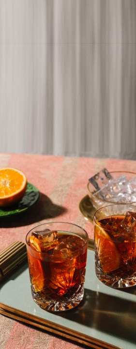 Ingredientes: 30 ml Campari • 30 ml de Cinzano Rosso • 45 ml bourbon o whisky de centeno. Garnish: piel de naranja sin carne blanca.