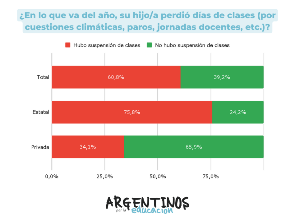 Según los resultados de la Encuesta Nacional Escolar, el 60,8% de las madres consultadas informan que sus hijos perdieron días de clase en primaria durante el primer semestre del año. La interrupción de la continuidad escolar fue mayor en las escuelas estatales (donde el 75,8% de las familias reportan interrupciones) que en las escuelas de gestión privada (donde la cifra es menos de la mitad: 34,1%).