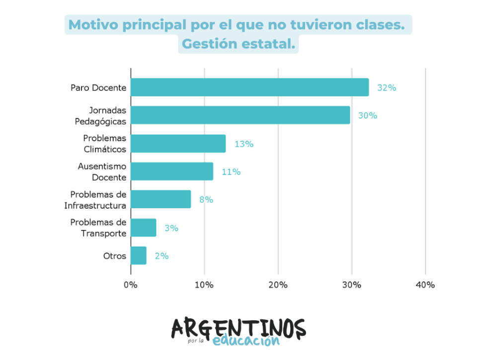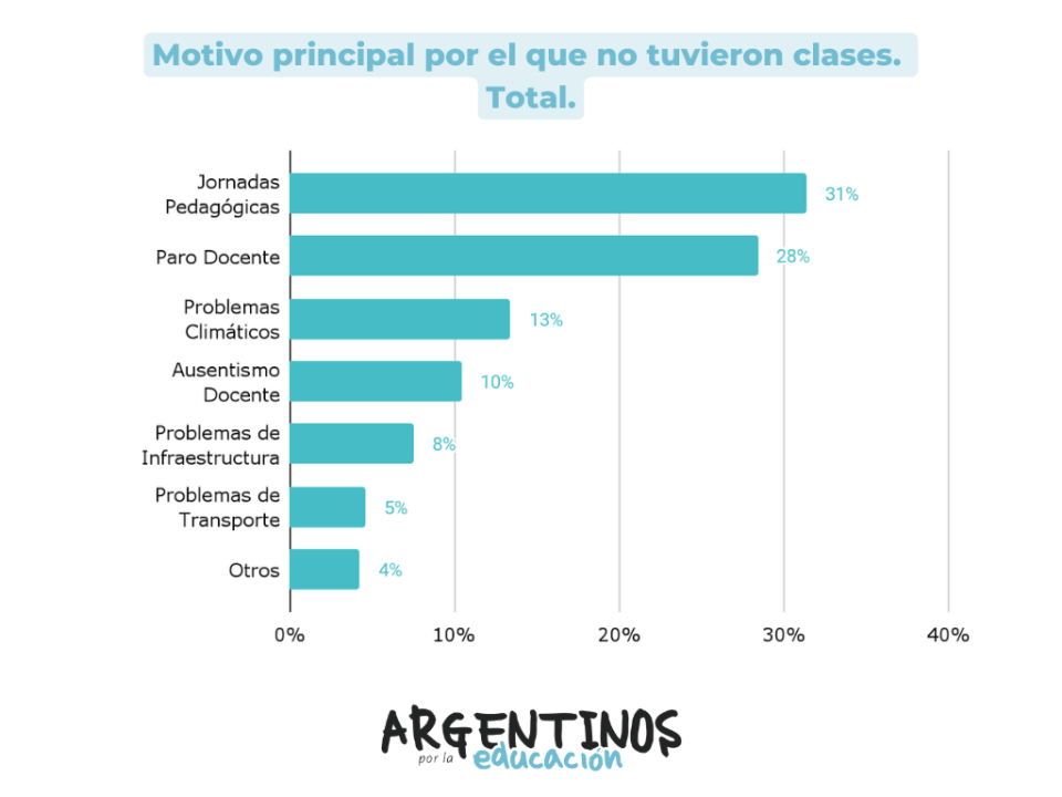 Las jornadas pedagógicas son identificadas como el principal motivo de pérdida de clases (las menciona el 31% de las encuestadas), seguidas por los paros docentes (28%) y los problemas climáticos (13%). En este sentido Guillermina Tiramonti, coautora del informe, advierte sobre “la falta de un sistema de contratación docente que contemple un tiempo de trabajo dedicado a los temas institucionales y a la capacitación en servicio”.