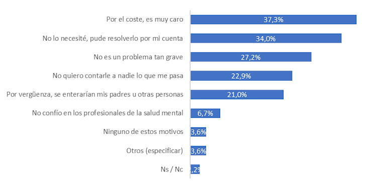 Más de la mitad de jóvenes (el 56,4 %) cree haber sufrido problemas de salud mental en los últimos 12 meses, y casi la mitad (un 49 %) no pidió ayuda profesional. Las razones esgrimidas son el coste de la atención profesional, en primer lugar, y especialmente entre las mujeres (44,8 %) frente a los hombres (27,5 %), seguida de otras razones que tienen que ver más con la subestimación del problema, las resistencias a compartir ese problema con su entorno y el estigma, que sigue generando sensaciones de vergüenza a la hora de abordarlo.