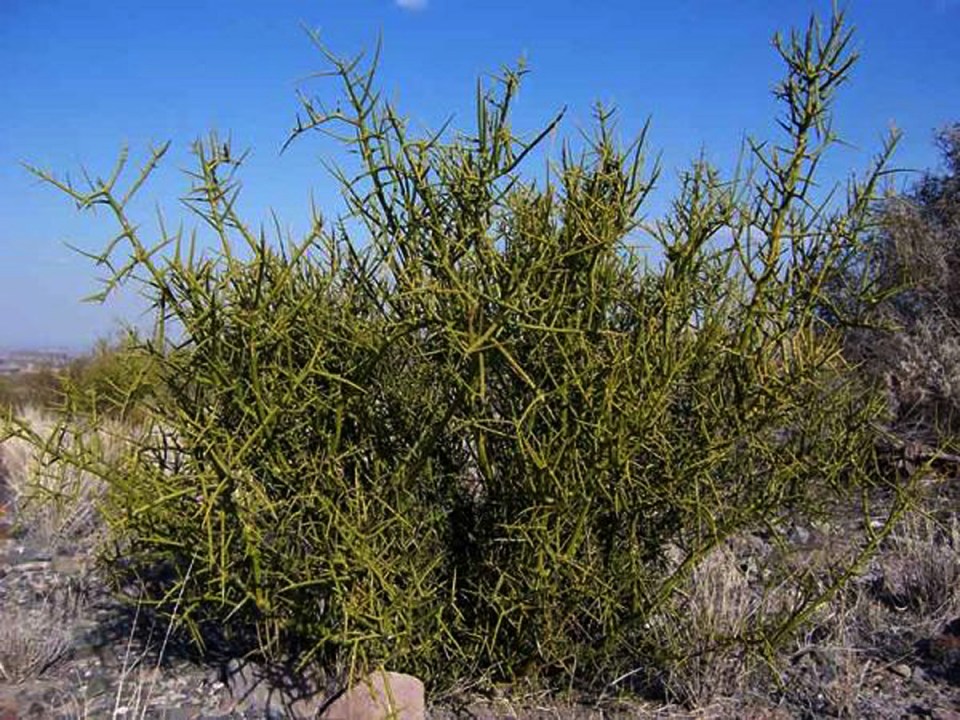 Las hojas son pequeñas, con lámina en forma de lanza. Tienen de 2,5 a 3 milímetros de largo y viven durante 70 a 80 días cubriendo el ápice del brote en crecimiento y luego caen. Las ramas de color verde intenso realizan la fotosíntesis. Esta es una adaptación que presentan algunas plantas de la barda al ambiente seco: reducción del follaje a fin de reducir la pérdida de agua.