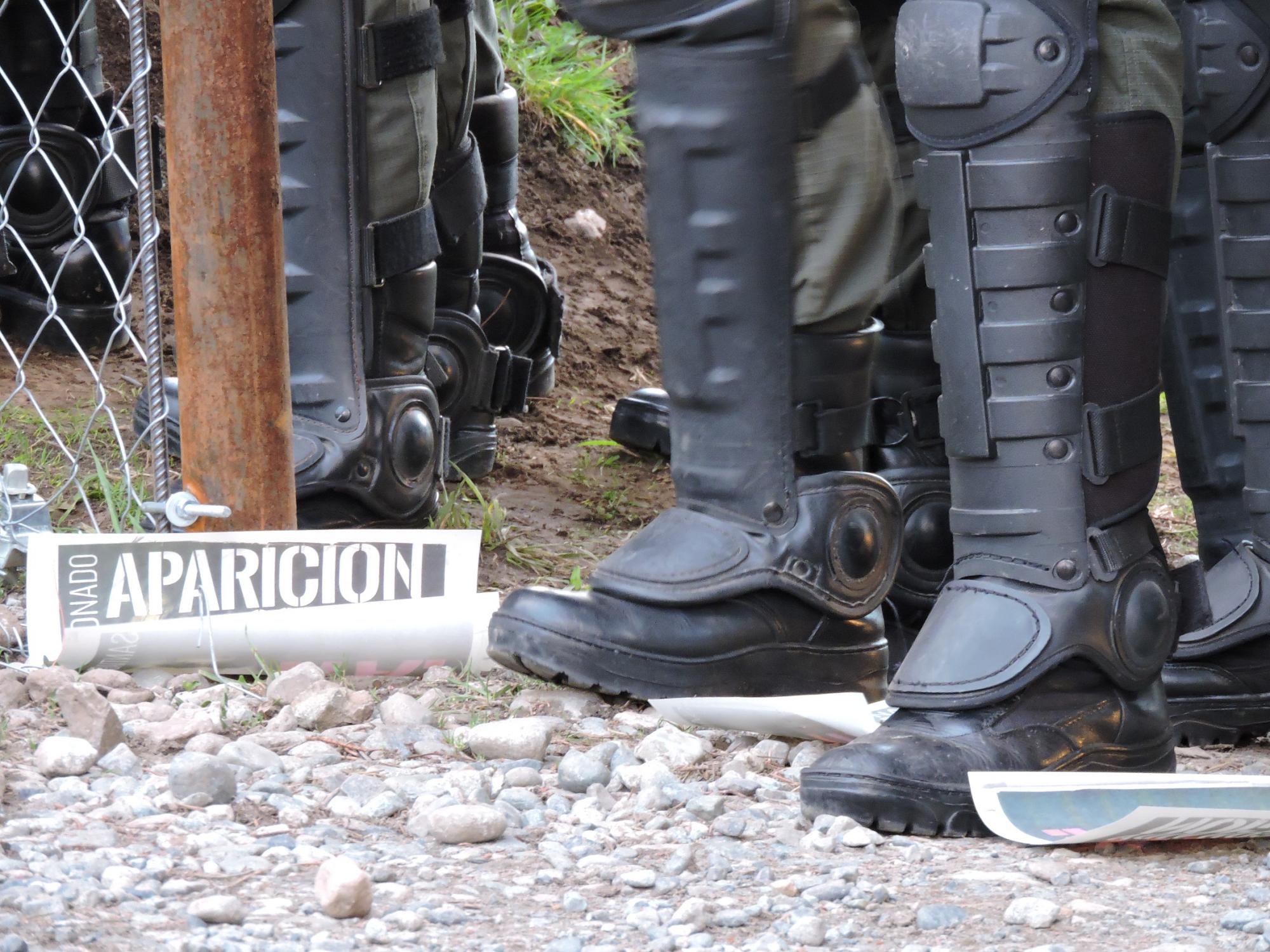 La mayoría de la columna permaneció sobre la ruta nacional 40, aunque una veintena se acercó hasta quedar cara a cara con los uniformados, a quienes gritaron consignas pidiendo por la aparición con vida de Santiago Maldonado.