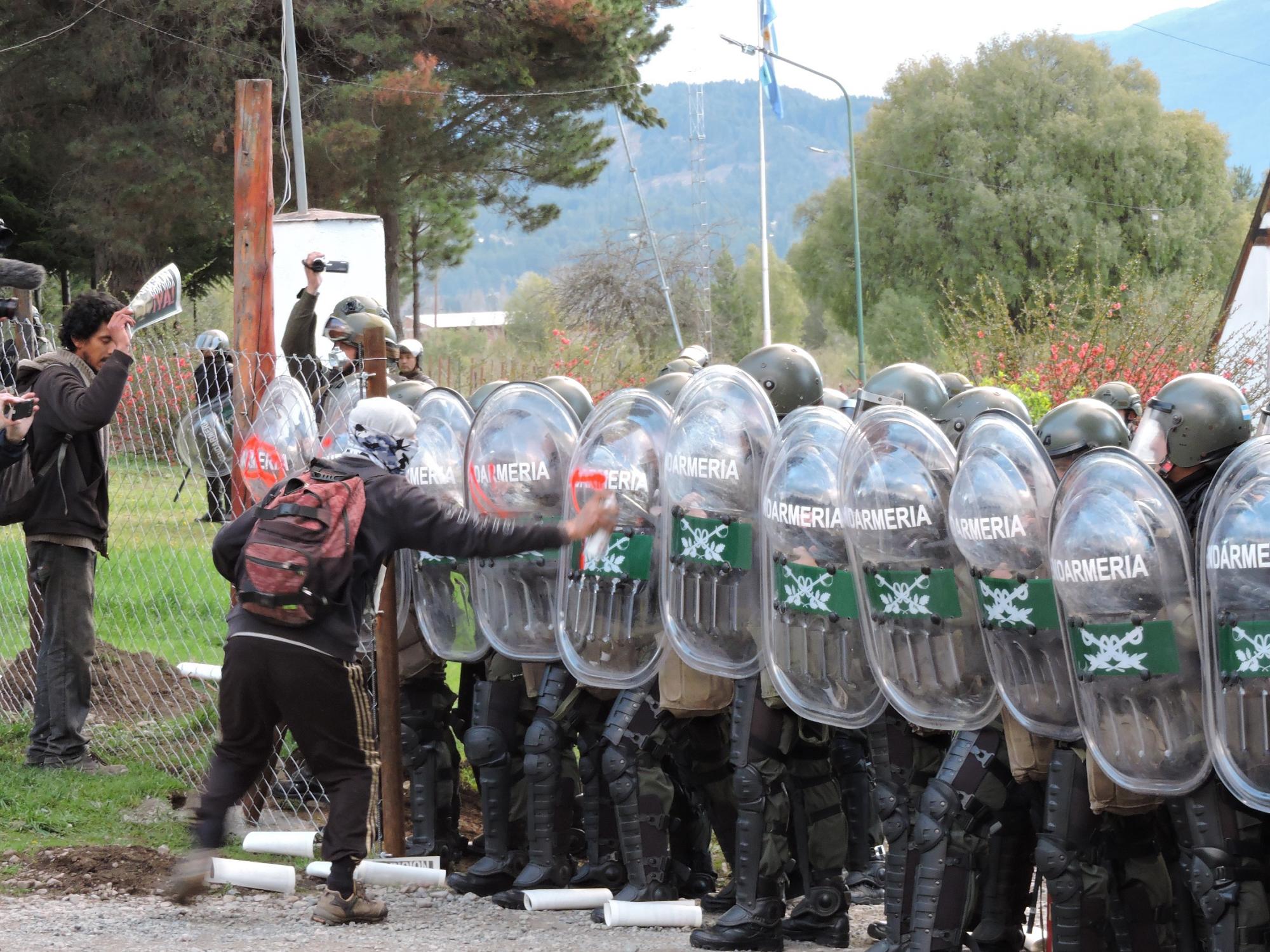 Unos 500 manifestantes marcharon ayer desde plaza Pagano hasta las puertas del Escuadrón 35 de la Gendarmería Nacional, ubicado en el acceso sur a El Bolsón, donde los esperaron más de 200 uniformados apostados con escudos, cascos y armas antimotines en los ingresos principales al cuartel, además de camiones hidrantes y otros pertrechos.