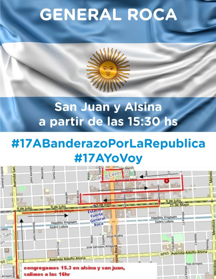 Un importante número de vecinos protestan a esta hora de la tarde por las calles de General Roca y Villa Regina, para exigir «libertad y defensa de la República» y para rechazar cualquier intento de la reforma en el Poder Judicial.