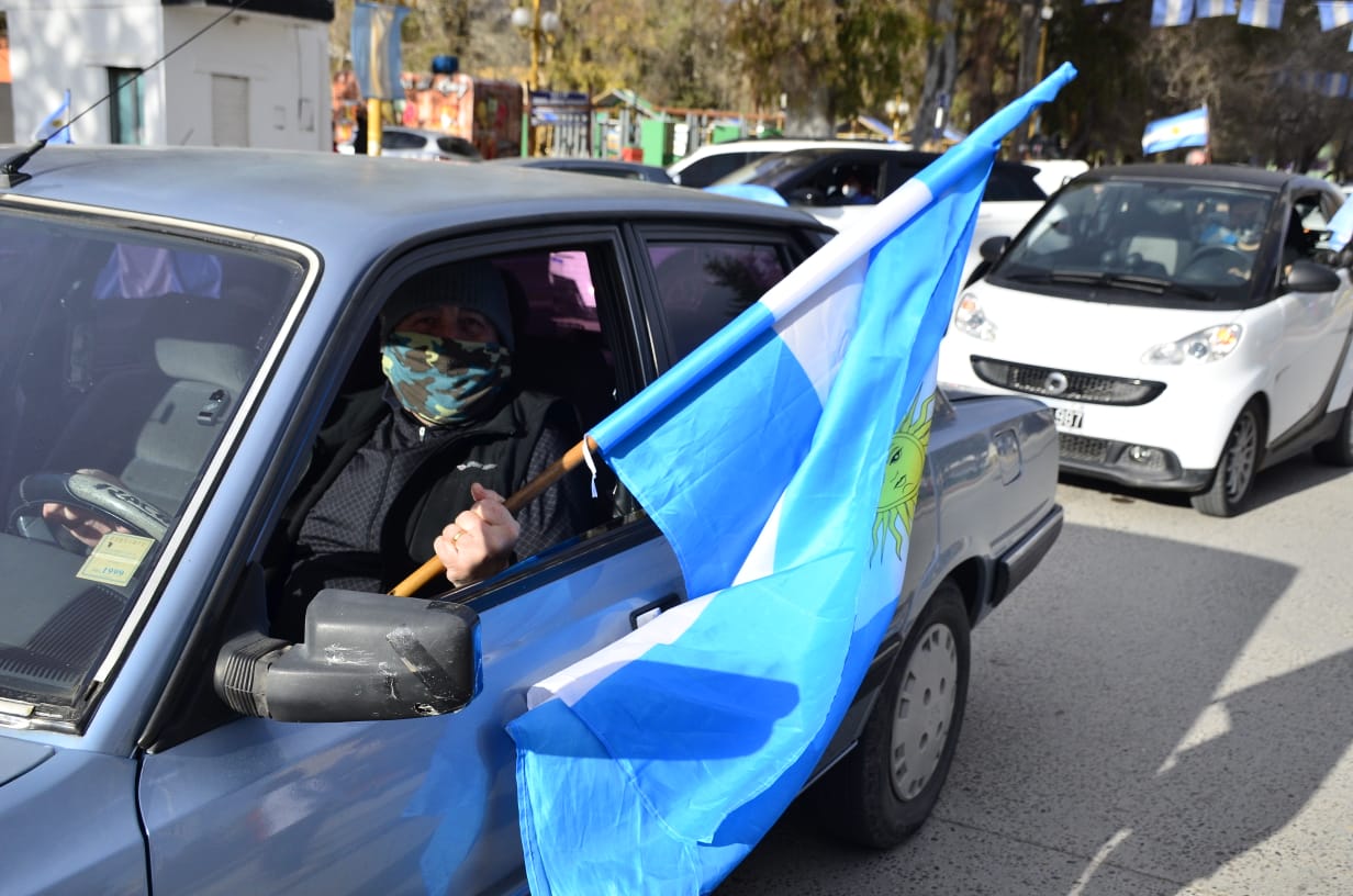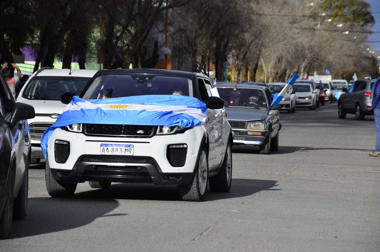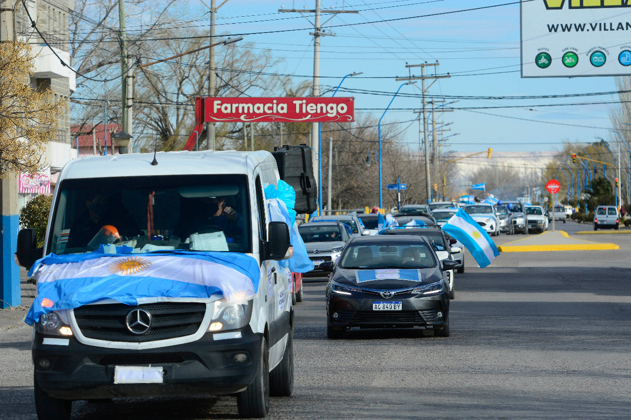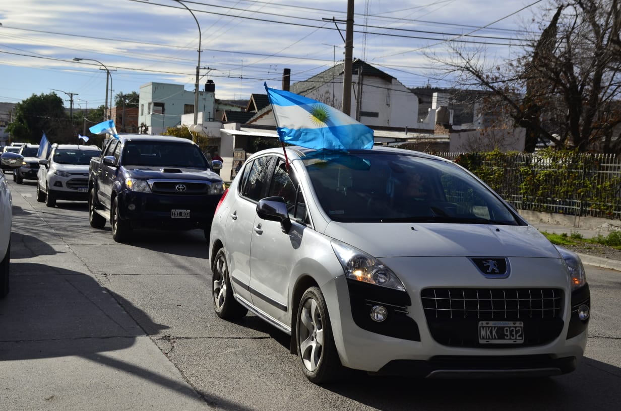 La doble columna de vehículos ingresó a la ciudad por calle 9 de Julio para comenzar con un extenso recorrido que tenía previsto, tal cual como se ha realizado en otras oportunidades, con la entonación del himno nacional en inmediaciones al Monumento a la Manzana, sobre avenida Roca y la zona del canalito.