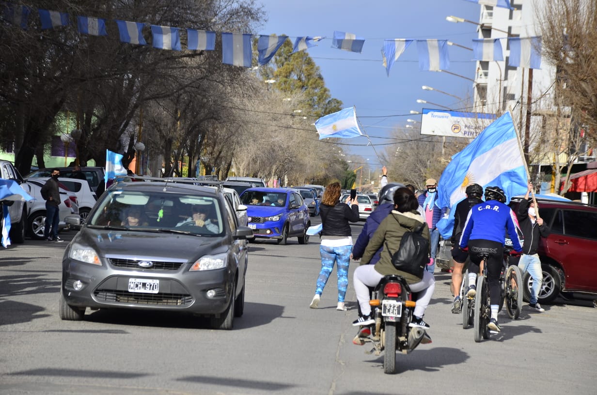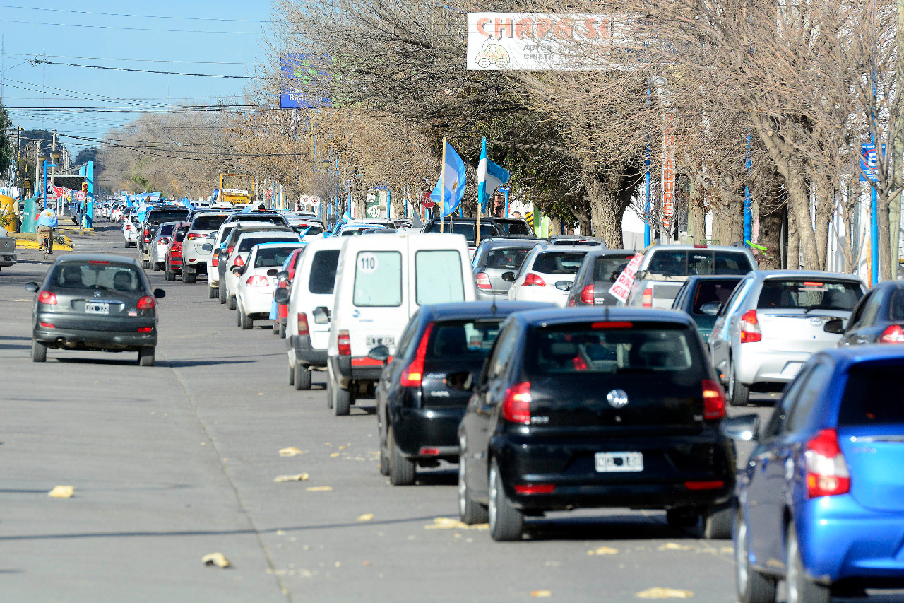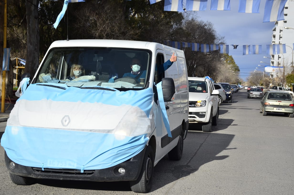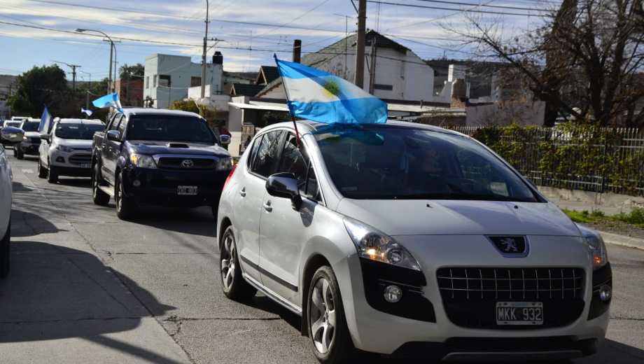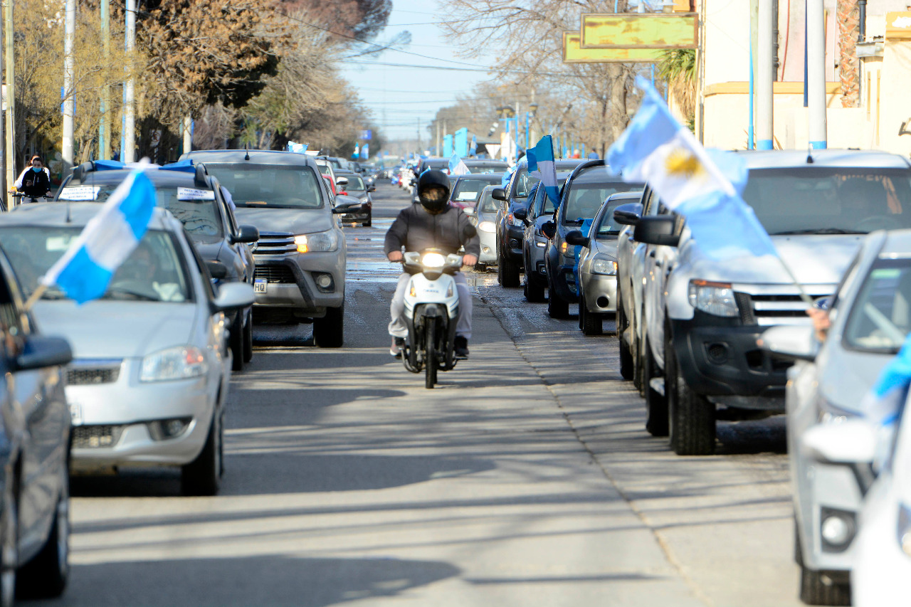 La doble columna de vehículos ingresó a la ciudad por calle 9 de Julio para comenzar con un extenso recorrido que tenía previsto, tal cual como se ha realizado en otras oportunidades, con la entonación del himno nacional en inmediaciones al Monumento a la Manzana, sobre avenida Roca y la zona del canalito.