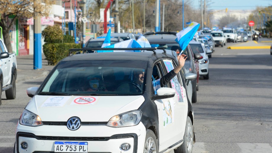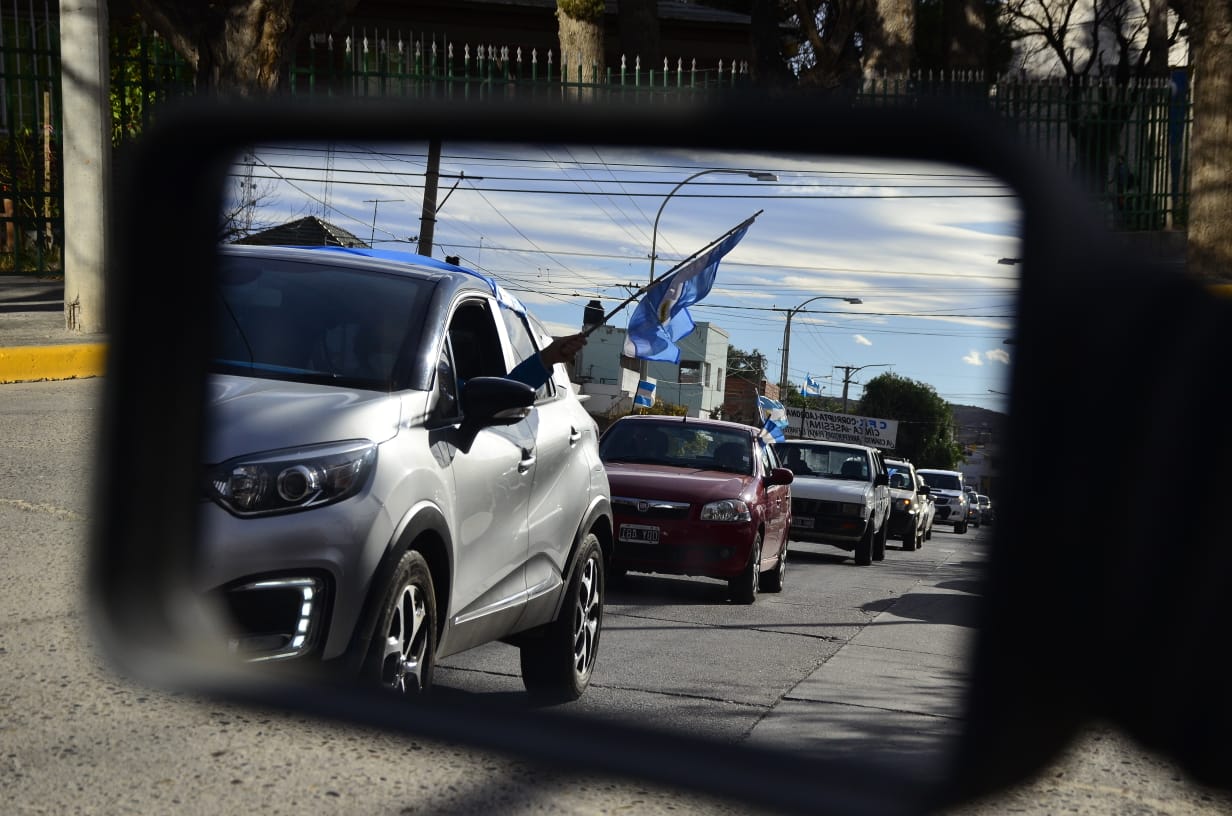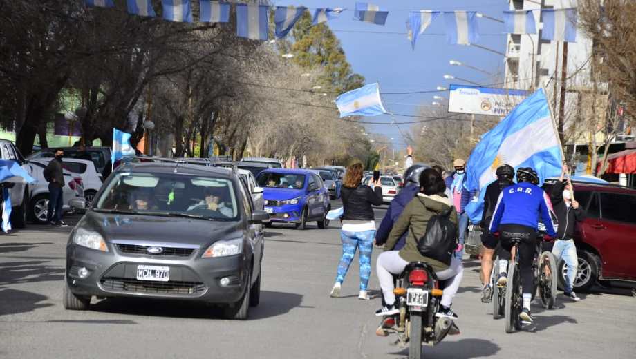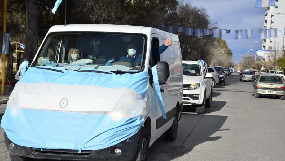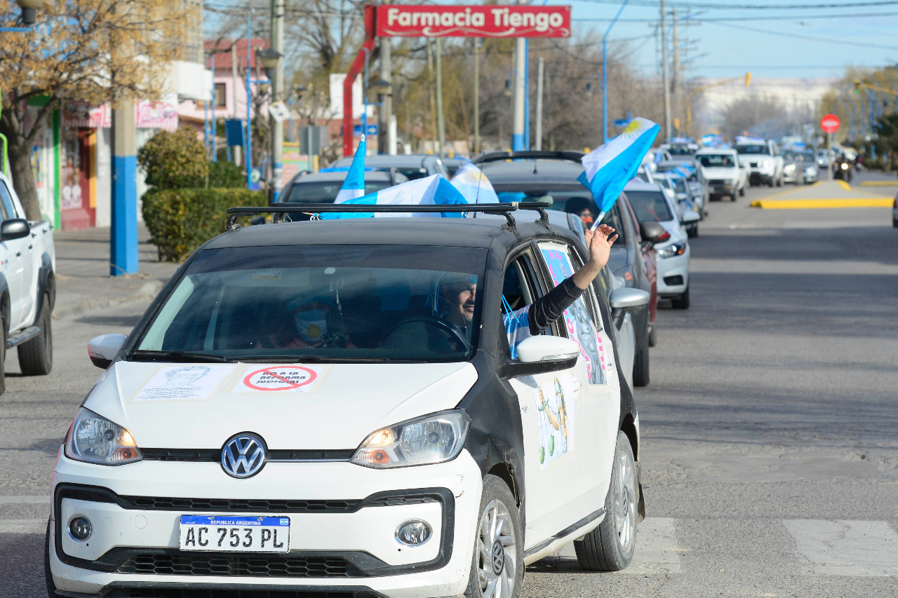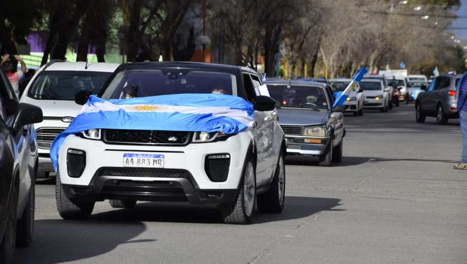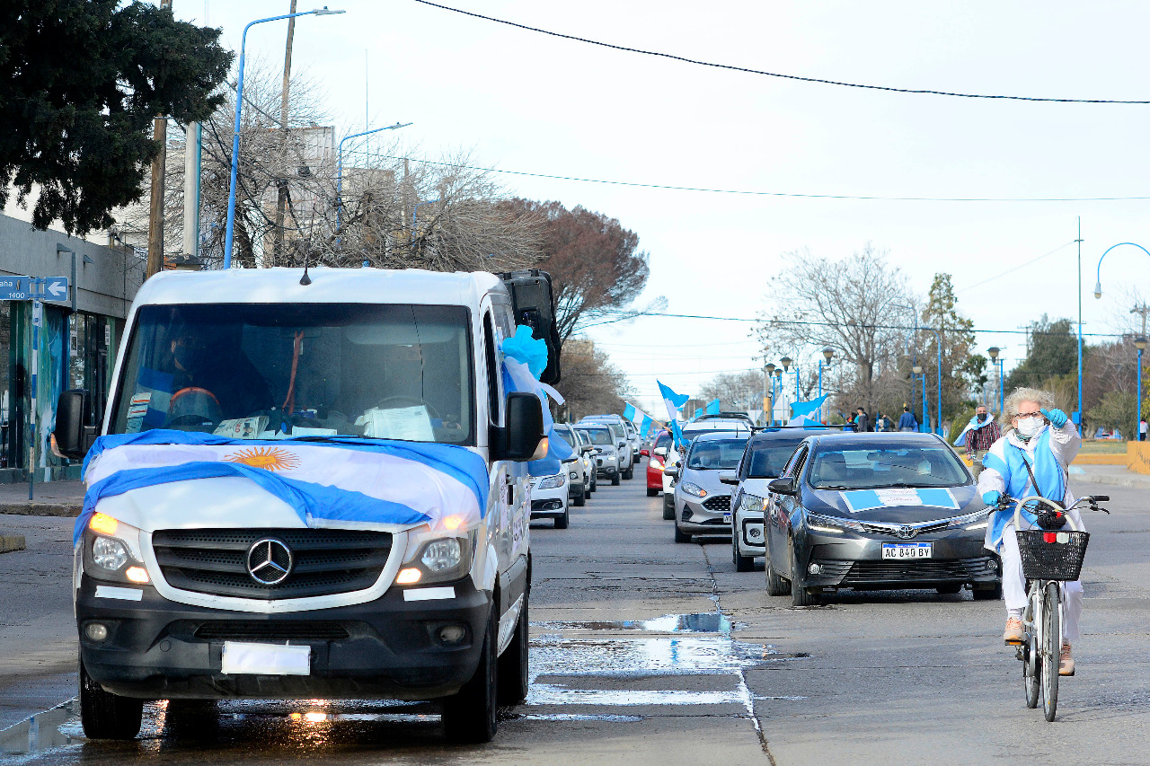 La doble columna de vehículos ingresó a la ciudad por calle 9 de Julio para comenzar con un extenso recorrido que tenía previsto, tal cual como se ha realizado en otras oportunidades, con la entonación del himno nacional en inmediaciones al Monumento a la Manzana, sobre avenida Roca y la zona del canalito.