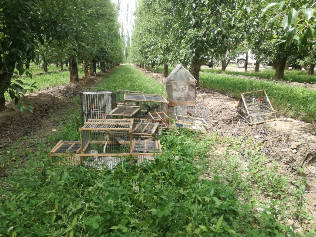 Las aves enjauladas se encontraban colgadas en una zona de chacras en la localidad de San Patricio del Chañar, situadas entre las picadas N° 13 y 14.