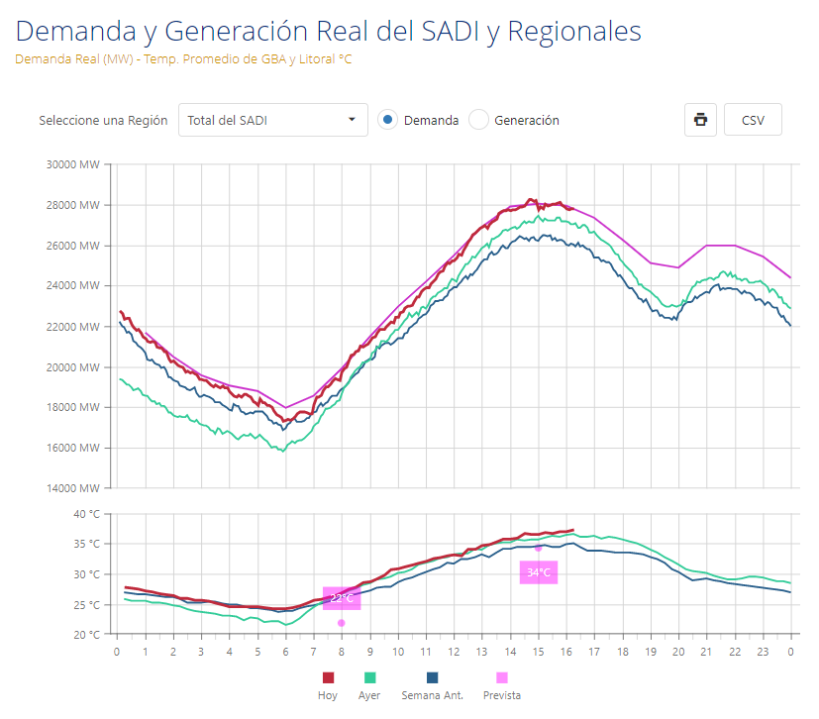 De acuerdo al portal de la Compañía Administradora del Mercado Mayorista Eléctrico (Cammesa), la demanda energética en el Sistema Argentino de Interconexión (SADI) alcanzó a las 14.45 de hoy una nueva marca histórica con una demanda de 28.266 MW.