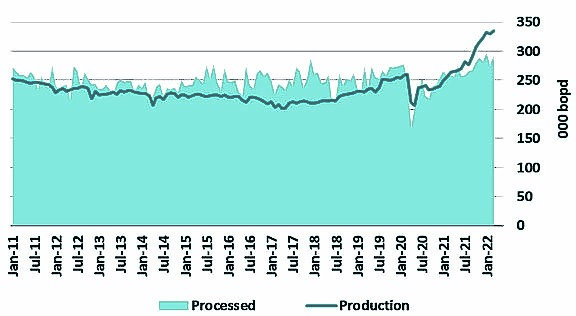 Los envíos de petróleo al exterior parecieran haber alcanzado un nivel estable, en torno a los 1,3 millones de barriles por mes. En total en el primer trimestre del año, estas exportaciones del crudo liviano de la zona suman 3.900.000 barriles, un 297% más que las registradas en el mismo período del año pasado.
