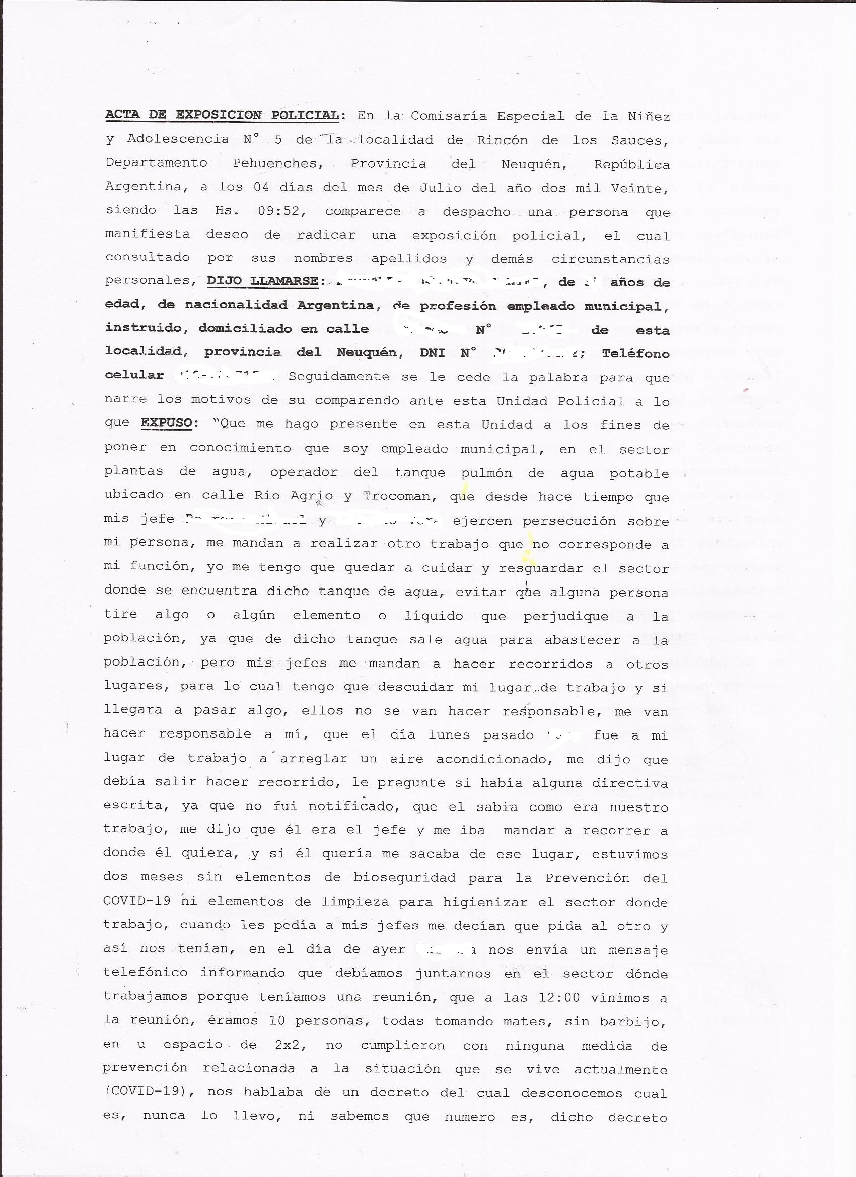 La falta de cuidado y de elementos de prevención frente al coronavirus en el sector de la planta de agua potable, fue denunciada en sede policial CENAF n°5 por un empleado municipal de Rincón de los Sauces, quien incluso relató que fue debió participar de “una reunión de unos 10 trabajadores, sin barbijo, en un espacio de dos por dos metros, todos tomando mate”.